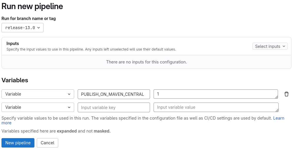 On second thought, we don’t even need a manual job, because we can filter the execution of the publish job on Maven Central, requesting that it only be executed if the tag matches the pattern X.Y.Z (and not X.Y.Z-RCN or X.Y.Z-SNAPSHOT).