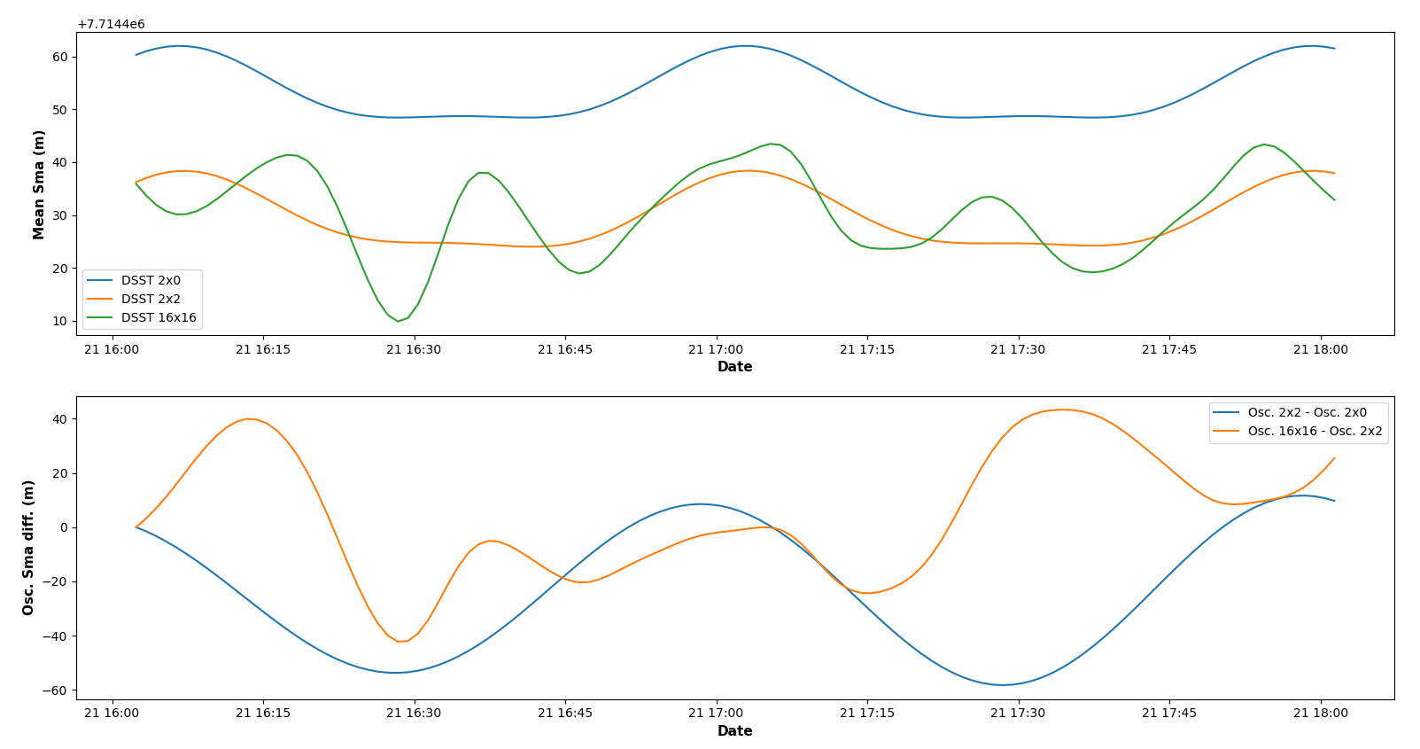 I was expecting to get a very approximate result in each case (the force model being the same between the osculating propagated orbit and the mean one). This is not the case (cf. below) and more annoyingly, increasing the degree/order seems to worsen the mean semi major-axis (less flat for 16x16 than for 2x2). Does this mean that DSST reduction is less efficient for high geopotential degree/order ?