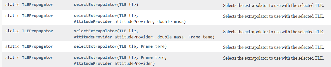 In the online documentation for TLEPropagator, there is a method named selectExtrapolator which takes the TLE as an argument. It also accepts parameters such as AttitudeProvider, Frame, and the objectâs mass.