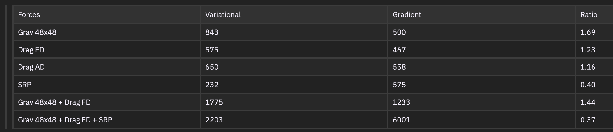 I have no doubt that the variational equations will be faster, if correctly implemented. The data show that the gravity model can be evaluated twice using only 1.7x the time as the Field version.