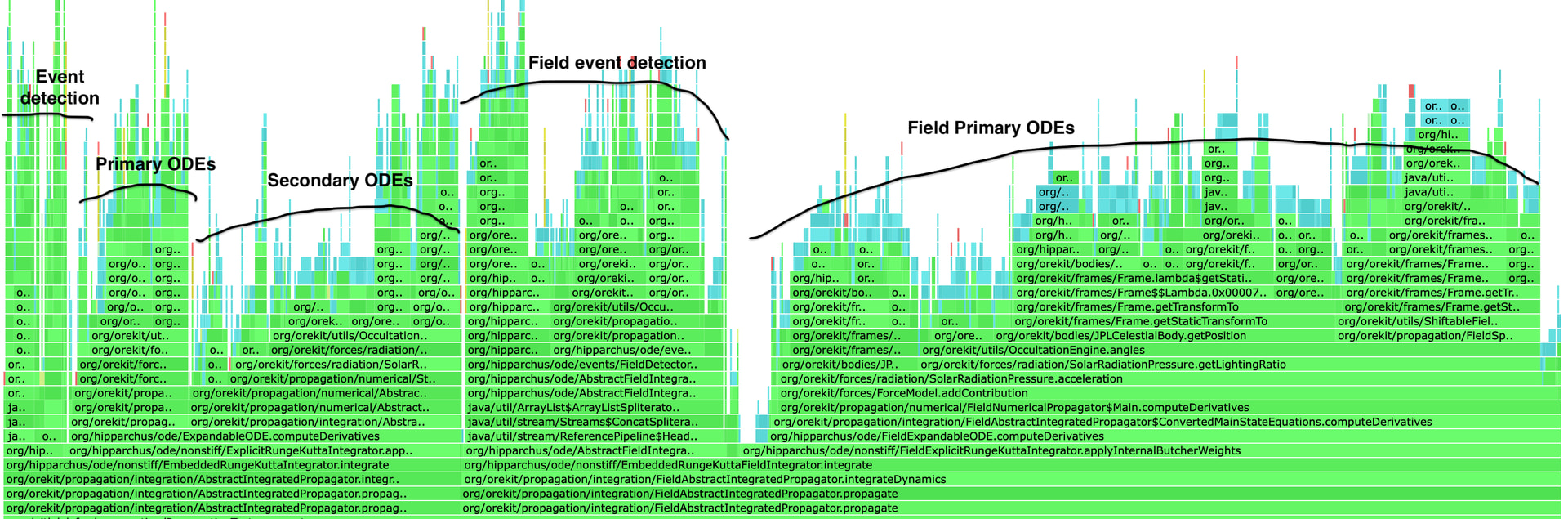 the full field approach is penalized by the fact that state epoch have now non-zero derivatives due to the eclipse event detection, so the speed-optimized implementation of the gravitational attraction cannot be used (as the gravitational attraction depends on the epoch via the GCRF → ITRF transformation)