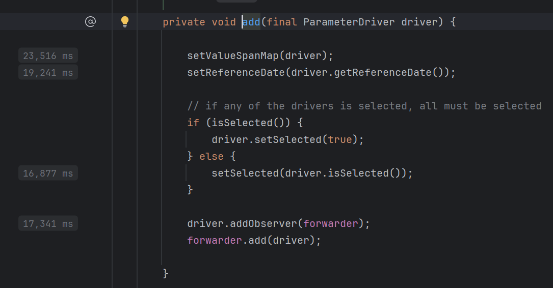 I thought it was some kind of performance issue on my side, so I ran the program again with a profiler. After some time, I stopped profiling, and the profiler told me that I was stuck in the getMeasurementsParametersDrivers method while trying to add drivers to parameters. I dug into the add method inside it, then dug into another add method, and got the following performance stats. I believe I’ve found a bottleneck in my program.